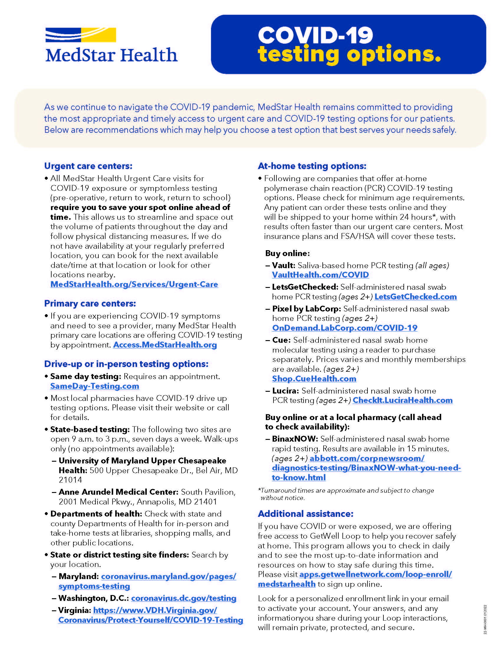 Illness care for the flu allergies and infections. This site is part of MedStar Healths distributed testing network for COVID19 including the 14 MedStar Health urgent care centers and many other MedStar primary care testing sites across. During this test we will swab your nose andor throat.